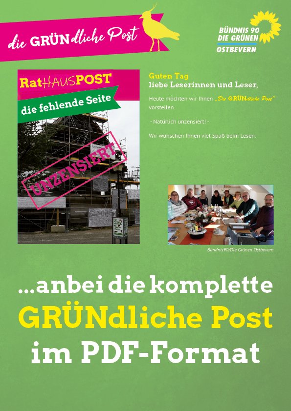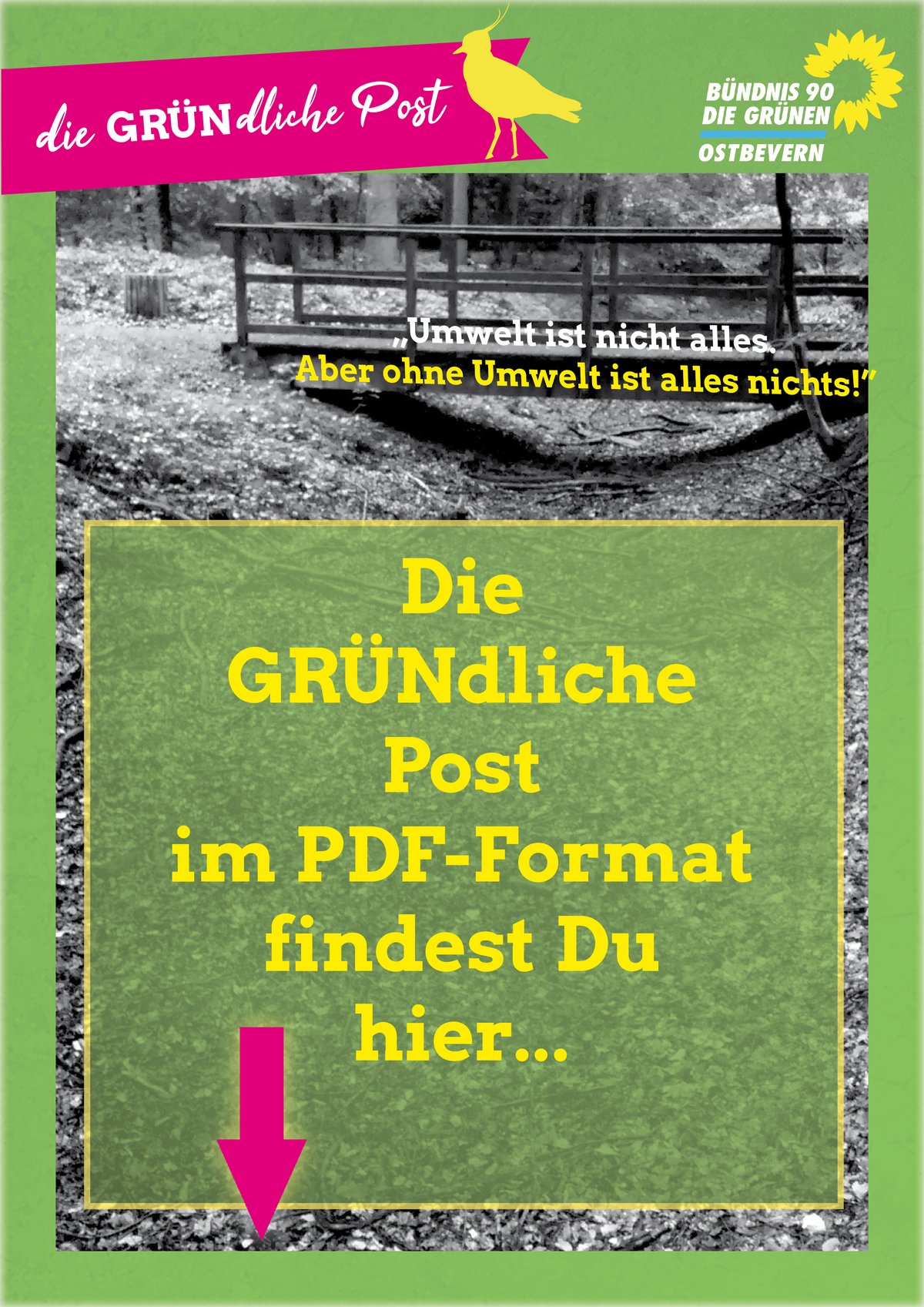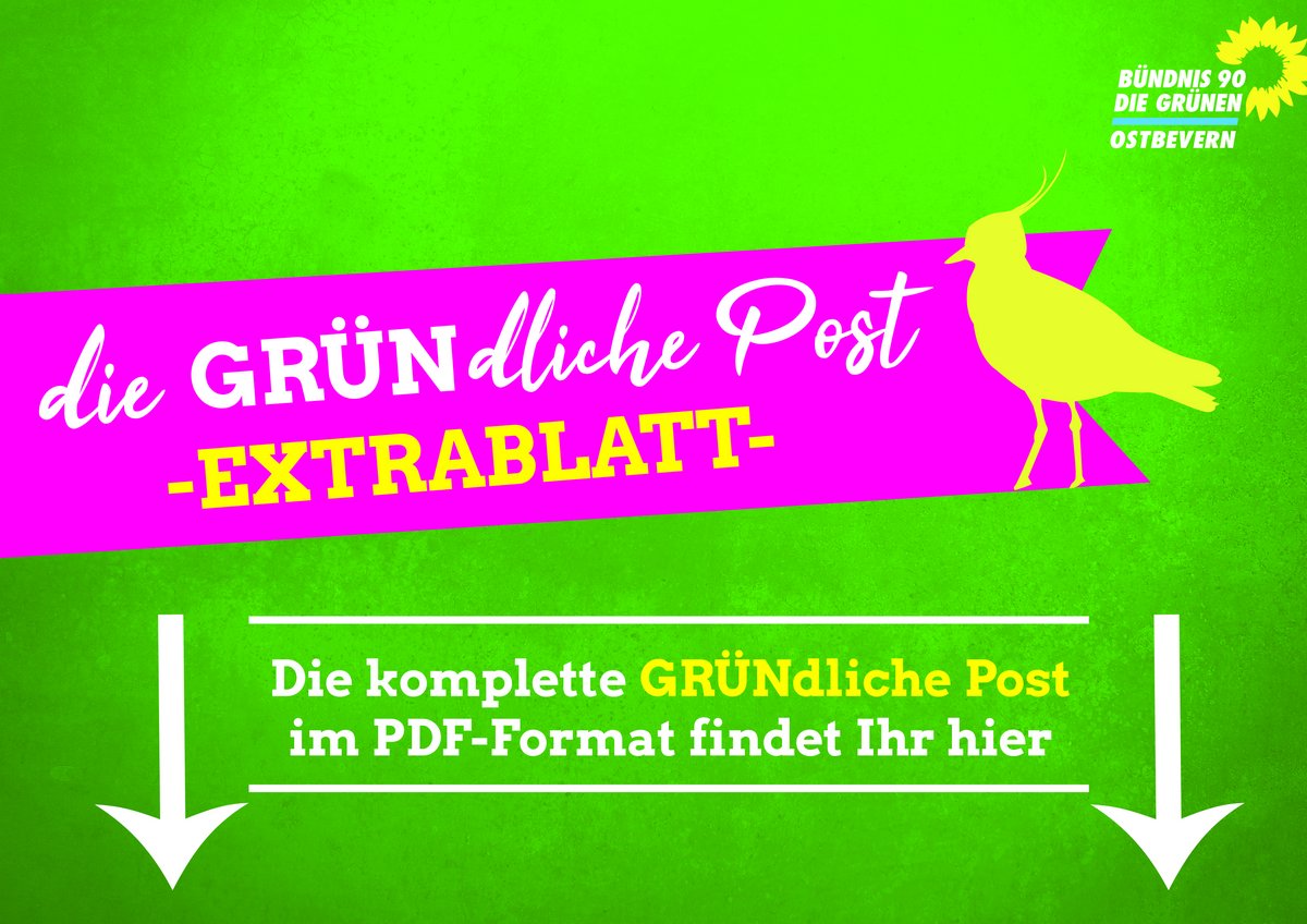 Soeben ist unsere neue, druckfrische Ausgabe der GRÜNdlichen Post eingetroffen. Klimaneutral gedruckt - inhaltlich selbstverständlich nicht neutral. Um es mit der Klimaneutralität beizubehalten, verteilen wir die GRÜNdliche Post in den nächsten Tagen eigenhändig. Freut euch auf unsere Informationspost in den nächsten Tagen!